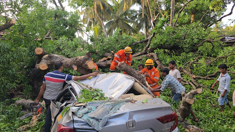 कारवरील झाड हटवताना अग्निशमन दलाचे जवान. (निवृत्ती शिरोडकर)