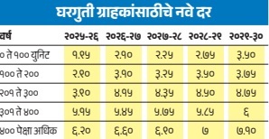 याआधी कमी दाब असणाऱ्या घरगुती ग्राहकांना ० ते १०० युनिटपर्यंत प्रती युनिट १.९० रुपये द्यावे लागत होते. २०२५-२६ मध्ये त्यात वाढ होऊन १.९५ रुपये द्यावे लागतील. १०१ ते २०० युनिटसाठीचे दर प्रती युनिट २.८० रुपयांवरून २.९० रुपये, २०१ ते ३०० युनिटसाठीचे दर प्रती युनिट ३.७० रुपयांवरून ३.९० रुपये, ३०१ ते ४०० युनिटसाठीचे दर प्रती युनिट ४.९० रुपयांवरून ५.१५ रुपये तर ४०० युनिटच्या वर ५.८० रुपयांवरून ६.२० रुपये प्रती युनिट इतके वाढवण्यात आले आहेत. आर्थिक वर्ष २०२९-३० पर्यंत हे दर वाढत जाणार आहेत.