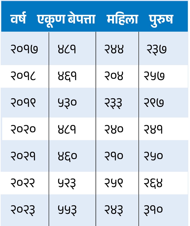 अहवालानुसार, २०२३ अखेरीस ९६३ पुरुष आणि ५१९ महिला मिळून १,४८२ व्यक्ती बेपत्ता होत्या. बेपत्ता महिला सापडण्याचे प्रमाण ४४.३ टक्के, तर पुरुषांचे प्रमाण २८.८ टक्के होते. बेपत्ता व्यक्ती सापडण्याचे एकूण प्रमाण ३४.२ टक्के राहिले. याची राष्ट्रीय सरासरी ५३.८ टक्के होती. केरळ, नागालँड, तेलंगणा, आसाम येथे हेच प्रमाण ८० टक्क्यांहून अधिक होते. ओडिशा, पंजाब, गोवा, झारखंड येथे हरवलेल्या व्यक्ती सापडण्याचे प्रमाण तुलनेने कमी होते.