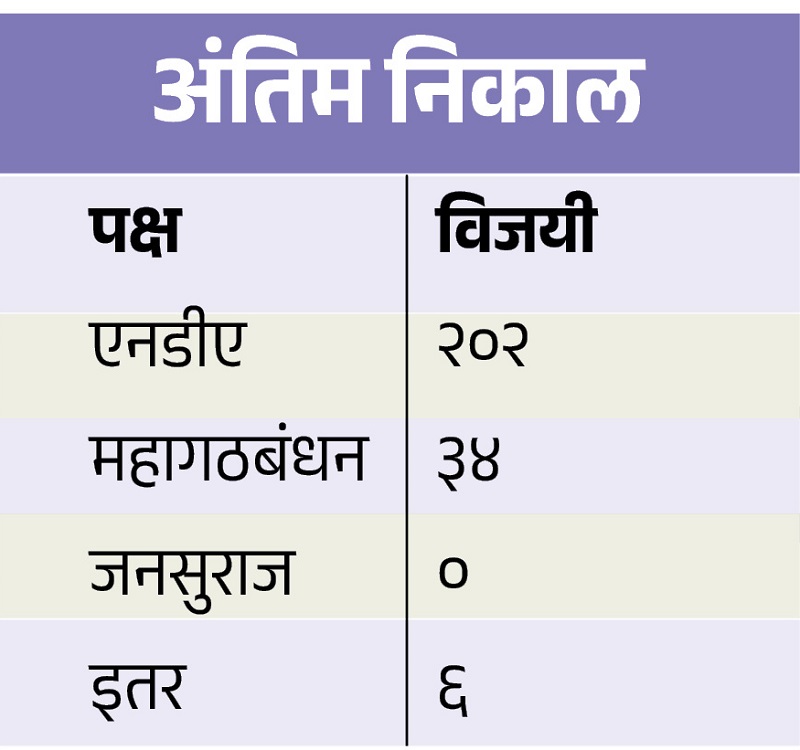 बिहारमध्ये काँग्रेसला फक्त ६ जागा : एनडीएचा २०२ मतदारसंघांत विजय, तर महागठबंधनला केवळ ३५ जागा
