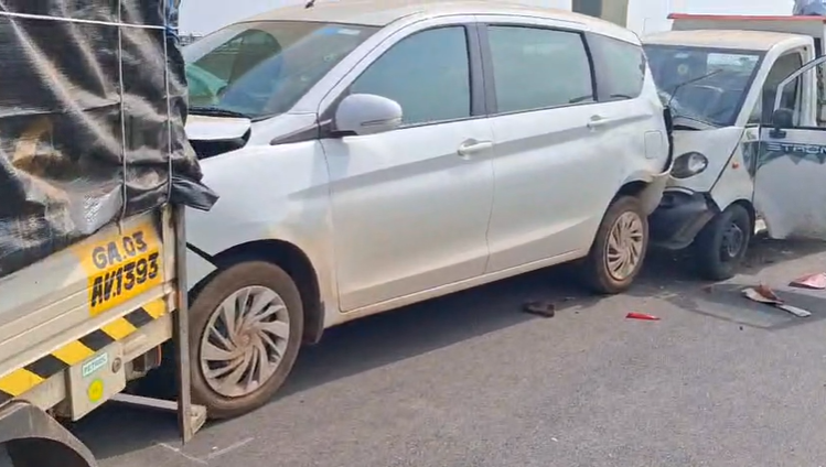 पणजी: जुन्या मांडवी पुलावर (Mandovi Bridge) आज शुक्रवारी झालेल्या एका भीषण अपघातात चार चारचाकी वाहने आणि एका दुचाकीचा समावेश होता. एका मालवाहू गाडीने (Goods Carrier) एका कारला जोरदार धडक दिल्यानंतर हा अपघात झाला आणि या अपघातामुळे इतर वाहनांची चेन रिएक्शन झाली. या अपघातात दुचाकीवर असलेल्या एक महिला व एक मुलगी किरकोळ जखमी झाल्या असून, सर्व वाहनांचे मोठे नुकसान झाले आहे.