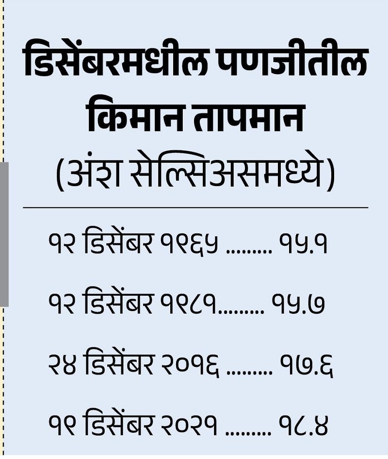 याआधीची डिसेंबर महिन्यातील आकडेवारी पाहता १२ डिसेंबर १९६५ रोजी पणजीत १५.१ अंश सेल्सिअस तापमानाची नोंद झाली होती. १२ डिसेंबर १९८१ मध्ये १५.७ अंश, २४ डिसेंबर २०१६ रोजी १७.६ अंश, तर १९ डिसेंबर २०२१ रोजी १८.४ अंश सेल्सिअस तापमानाची नोंद झाली होती.