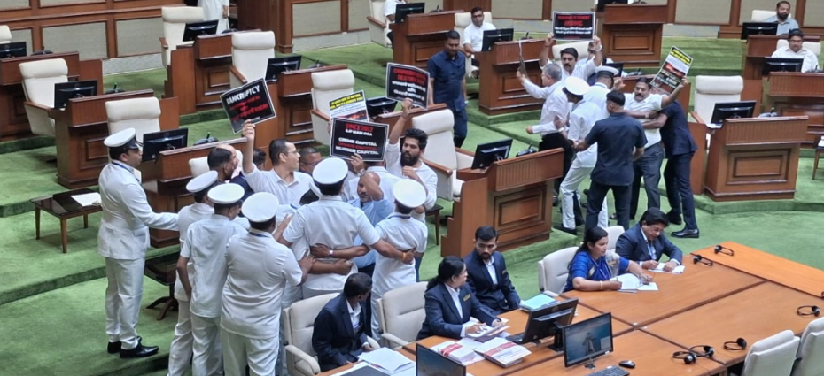 पणजी: गोवा विधानसभेच्या हिवाळी अधिवेशनाचा पहिलाच दिवस वादळी ठरला. बर्च क्लब दुर्घटनेतील मृतांना श्रद्धांजली वाहण्याच्या आणि त्यावरील चर्चेच्या मागणीवरून विरोधी आमदारांनी सभागृहात प्रचंड गदारोळ केला. राज्यपालांच्या अभिभाषणादरम्यान विरोधकांनी सभापतींच्या हौदात धाव घेतल्याने, अखेर मार्शल्सना बोलावून सर्व विरोधी आमदारांना सभागृहाबाहेर काढण्यात आले.