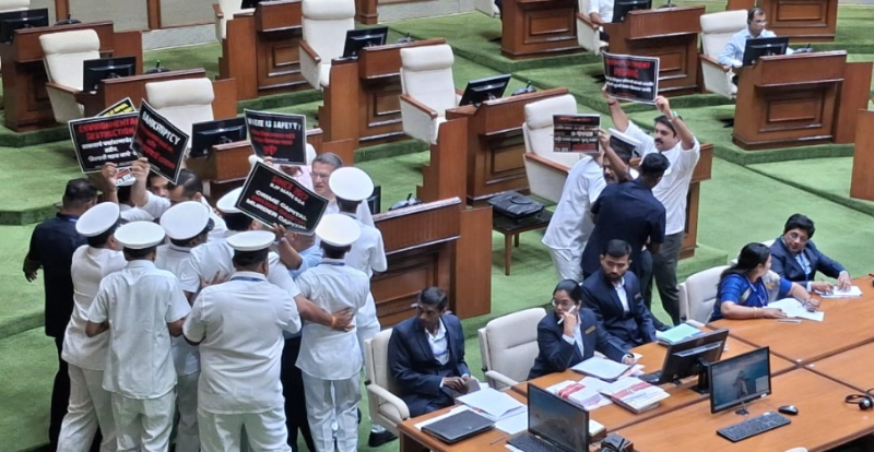 सभापतींनी विरोधी आमदारांना वारंवार आपल्या जागेवर बसण्याची विनंती केली, परंतु गदारोळ न थांबल्याने त्यांनी मार्शल करवी विरोधकांना सभागृहाबाहेर काढण्याचे आदेश दिले. त्यानंतर युरी आलेमाव, विजय सरदेसाई, कार्लुस फेरेरा, एल्टन डिकोस्टा, वेन्झी व्हिएगस, क्रुझ सिल्वा आणि विरेश बोरकर या सर्व आमदारांनी विरोधी पक्ष कक्षात पत्रकार परिषद घेऊन सरकारवर जोरदार टीका केली.