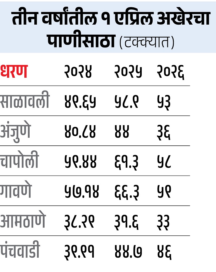 मिळालेल्या माहितीनुसार, १ एप्रिल २०२५ रोजी दक्षिण गोव्याची तहान भागवणाऱ्या साळावली धरणात ५८.९ टक्के पाणीसाठा होता. १ एप्रिल २०२६ अखेरीस या धरणात ५३ टक्के पाणीसाठा आहे. अंजुणे धरणात मागील वर्षी ४४ टक्के, तर यावर्षी १ एप्रिल अखेरीस ३६ टक्के पाणीसाठा शिल्लक आहे. गतवर्षी गावणे धरणात ६६.३ टक्के, तर यावर्षी ५९ टक्के पाणीसाठा शिल्लक आहे. गतवर्षी पंचवाडीत ४४.७ टक्के पाणीसाठा शिल्लक होता. यावर्षी या धरणात ४६ टक्के पाणीसाठा आहे.