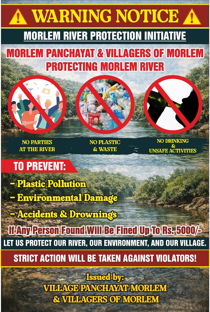 मोर्ले ग्रामपंचायतीने नदीकिनारी ‘आंघोळीला बंदी’ दर्शविणारे फलक लावले असूनही पर्यटकांकडून त्याकडे दुर्लक्ष केले जात आहे. सरपंच अमित शिरोडकर यांनी सांगितले की, नदीकिनारी आंघोळीवर बंदी घालण्यात आली आहे. आदेशाचे उल्लंघन करणाऱ्यांवर कारवाई करण्यात येईल.