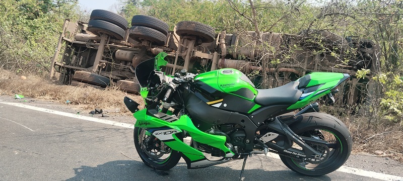 देवसडो-धारबांदोडा येथील धोकादायक वळणावर दुचाकीस्वाराला वाचविण्याच्या प्रयत्नात मालवाहू ट्रक उलटला. कावासाकी नींजा दुचाकीची धडक बसण्याची शक्यता असल्याने ट्रकचालकाने रस्त्याच्या बाजूला ट्रक घेतला असता तो उलटला. तरीही दुचाकीची धडक ट्रकला बसली. अपघातात दोन्ही चालक सुखरूप असून दुचाकीचे मोठे नुकसान झाले.