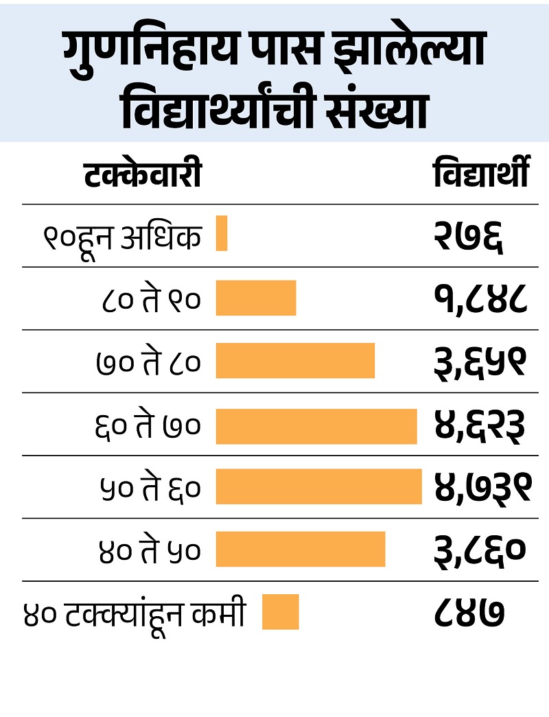 ८० ते ९० टक्के गुण मिळवलेल्या विद्यार्थ्यांची संख्या १,८४८ आहे. त्यानंतर ७० ते ८० टक्के गुण मिळवणारे विद्यार्थी ३,६५९ आहेत. ६० ते ७० टक्के गुण मिळवणारे विद्यार्थी ४,६२३ आहेत. ५० ते ६० टक्के गुण मिळवणारे ४,७३९, तर ४० ते ५० टक्के गुण मिळवणारे विद्यार्थी ३,८६० आहेत. ४० टक्क्यांपेक्षा कमी गुण मिळवणारे ८४७ विद्यार्थी आहेत. ८४७ हा आकडा नगण्य म्हणता येणार नाही. पास झालेल्या ७५ टक्क्यांहून अधिक विद्यार्थ्यांना ५० टक्क्यांपेक्षा अधिक गुण मिळाले आहेत. ही समाधानाची गोष्ट आहे.